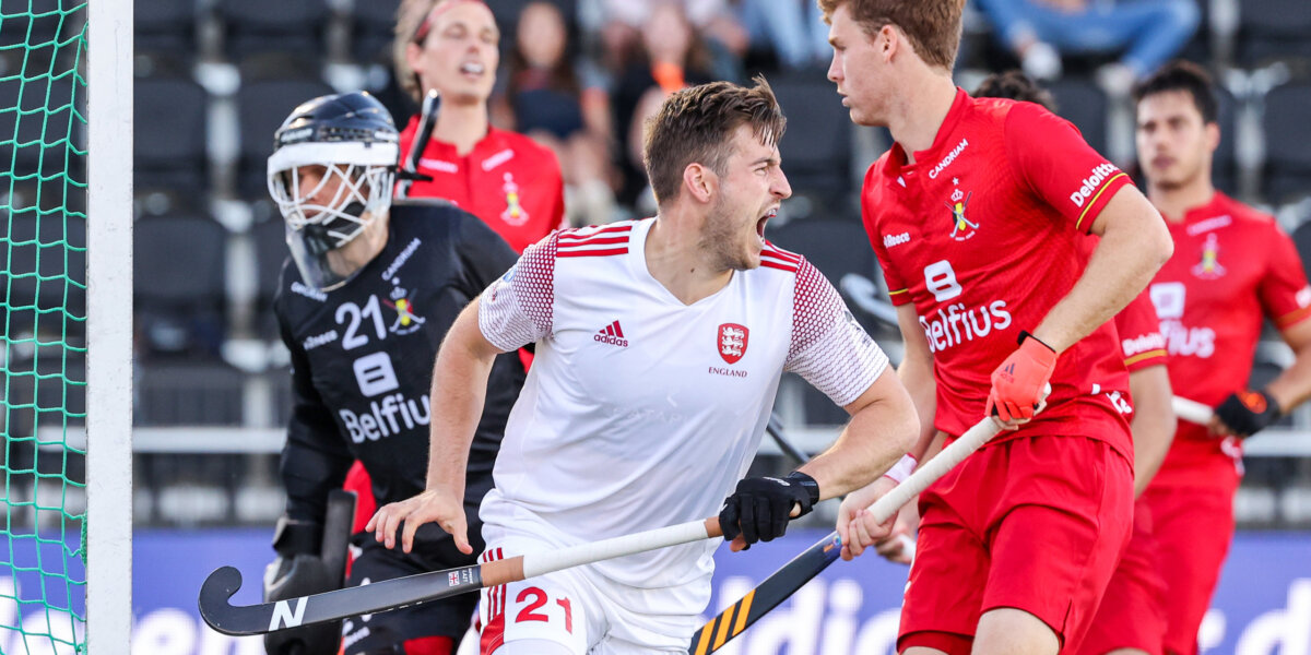 In de vierde minuut kwam Engeland op voorsprong tegen de Europees kampioen België. Na een serie van vier strafcorners op rij kwam de bal op de voet bij lijnstop Florent van Aubel. De toekende strafbal werd benut door Zachary Wallace. Het was alweer het derde tegendoelpunt voor de Belgen. In twee duels hadde de Red Lions al meer tegendoelpunten geïncasseerd dan in het gehele toernooi twee jaar geleden in Antwerpen.