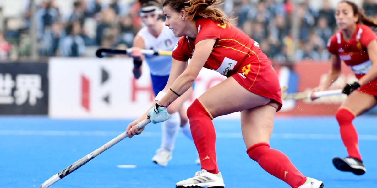 Lucía Jiménez in actie voor Spanje tegen Italië tijdens de FIH Nations Cup in Valencia. Foto: Worldsportpics/Will Palmer
