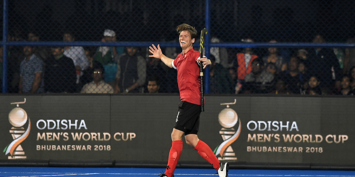 Floris van Son rent juichend weg na de 1-1 tegen India. Foto: Charles McQuillan/Getty Images