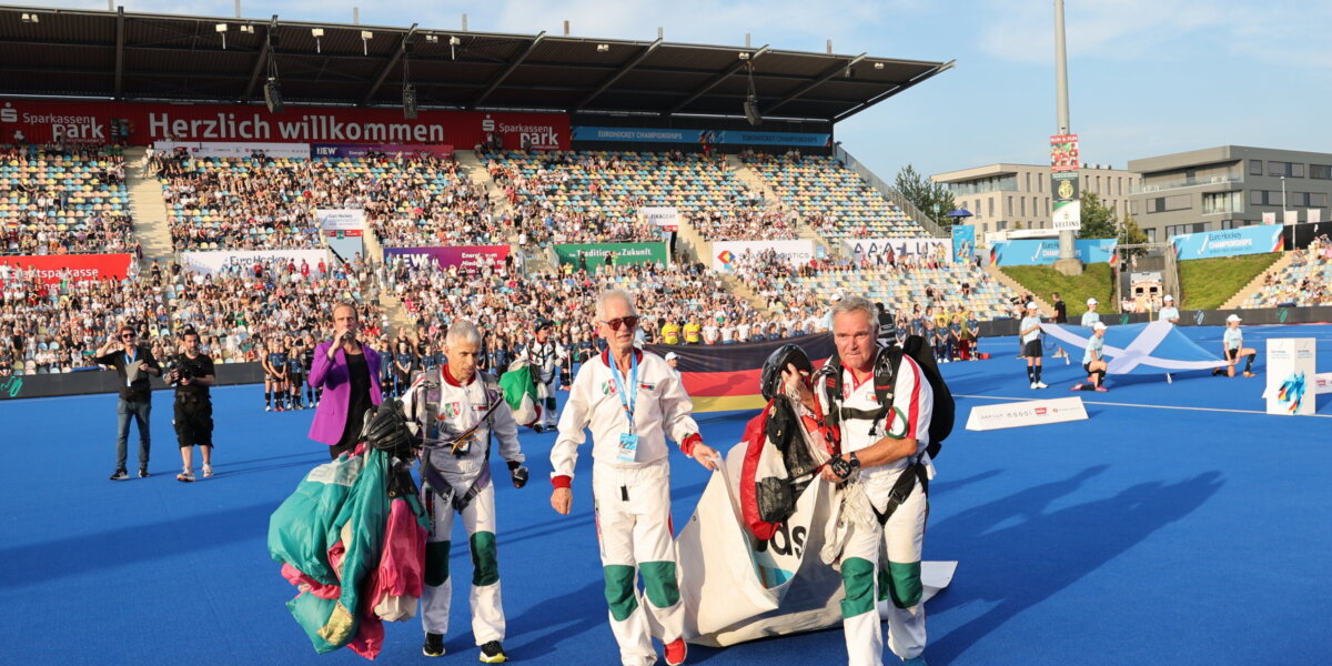 Rond de klok van half acht, vlak voor de afslag van de openingswedstrijd van de Duitse vrouwen tegen Schotland, staarden de ogen van vrijwel alle toeschouwers verwachtingsvol naar de hemel. Uit een vliegtuig dat boven het SparkassenPark zweefde, sprongen drie waaghalzen naar beneden, ieder aan een eigen parachute. Bedoeling was dat zij op een kruis zouden landen dat midden op het veld was gelegd, maar ze dobberden kriskras door de lucht. Eén van hen toucheerde zelfs bijna een lichtmast. Gelukkig bleek het bij de show te horen en landden ze veilig op de blauwe mat. Weliswaar niet op het kruis, maar desondanks was het toch een vrij spectaculair begin van het EK, nadat Engeland-Ierland in dezelfde poule al was gespeeld (3-0).