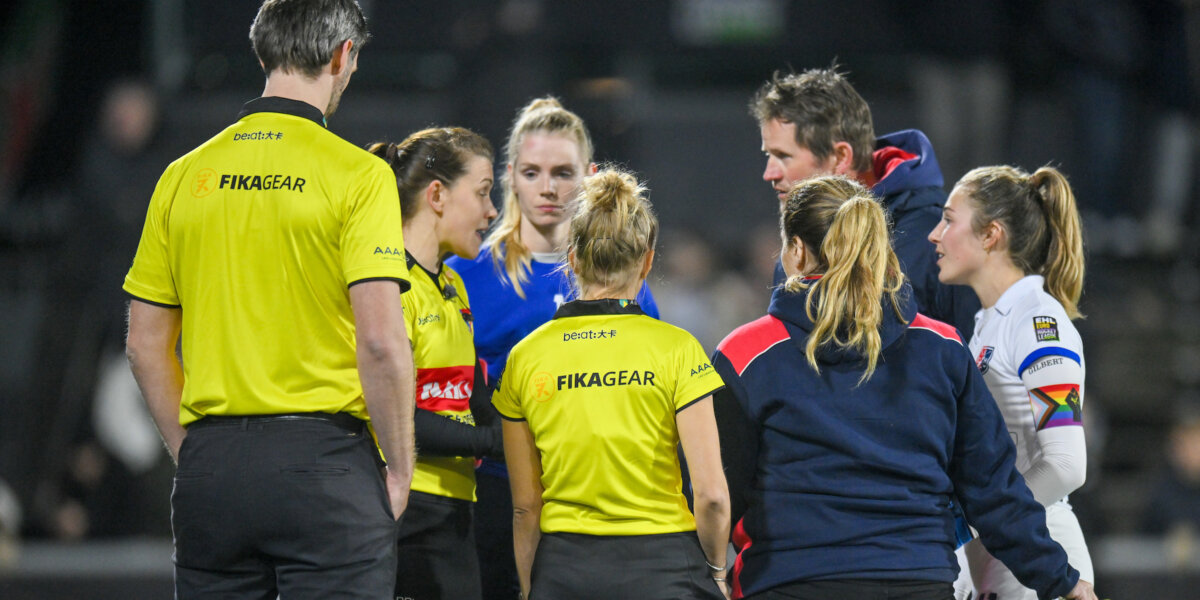 Scheidsrechter Hannah Harrison kent SCHC een strafbal toe. Videoscheidsrechter Tim Meissner draait die beslissing terug. Foto: EHL/WorldSportPics/Frank Uijlenbroek