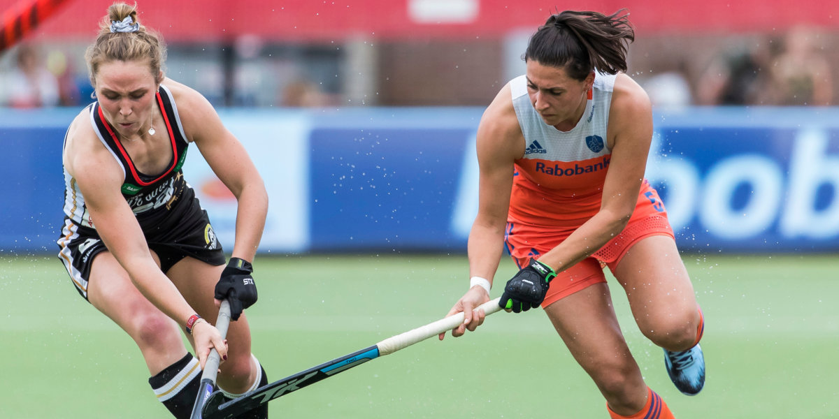 Nike Lorenz (l) en Ginella Zerbo vechten om de bal tijdens Nederland-Duitsland (2-1) in de Pro League van 2019. Foto: Willem Vernes