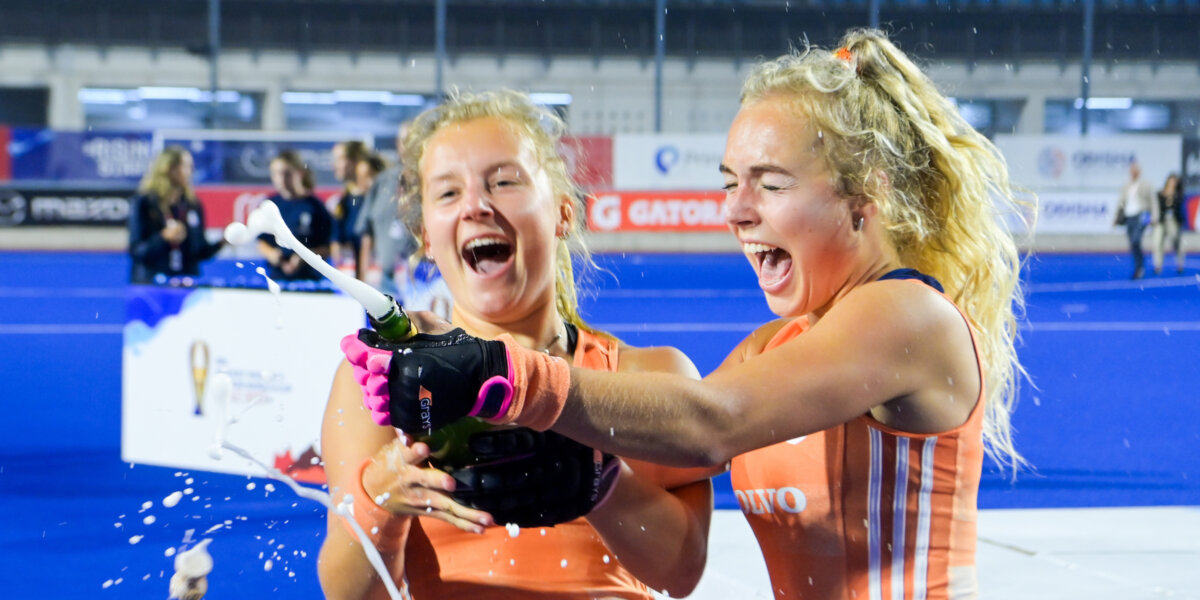 ‘Lilli de Nooijer en Sam Luttmer vieren het behalen van de wereldtitel. Aan hun gezichten zie je hoe blij ze zijn. De champagne spuit er net uit. De kurk zie je nog. Een mooie afsluiting van het WK.’