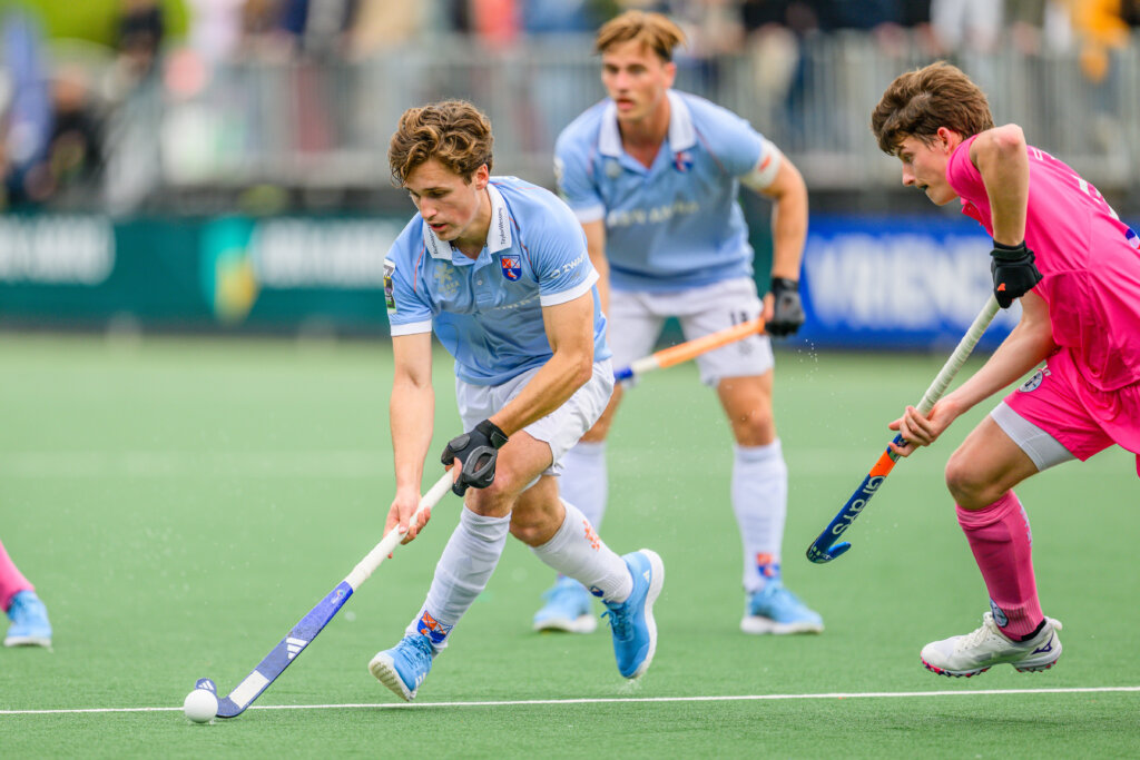 Lucas Veen aan de bal tijdens de EHL-finale tussen Bloemendaal en Gantoise. Foto: Bart Scheulderman