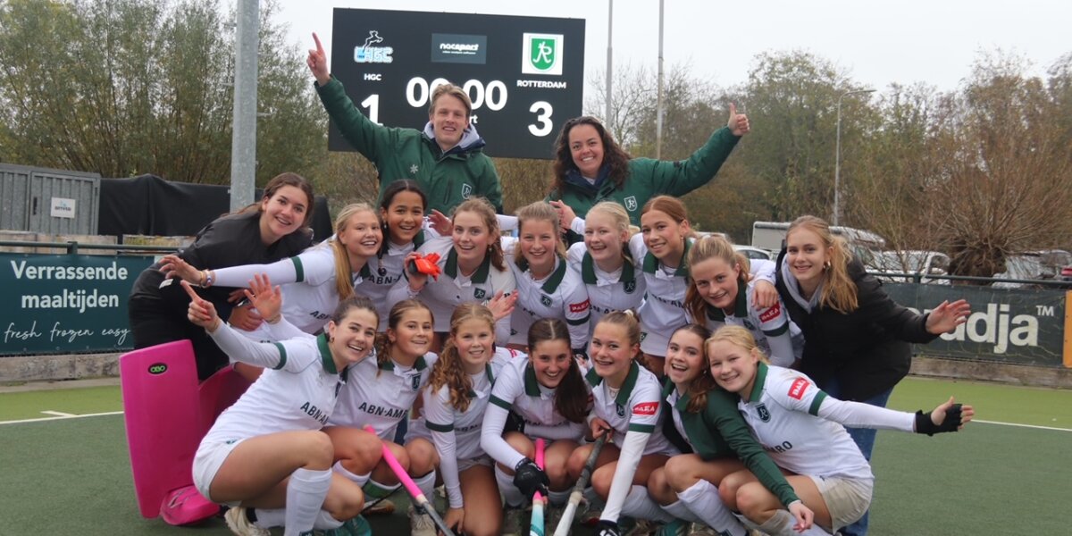 Rotterdam MO16 heeft zaterdag in Wassenaar de topper tegen HGC met 3-1 gewonnen. Daarmee behield de ploeg na de achtste speeldag niet alleen haar ongeslagen status en de koppositie in Poule F, maar plaatste Rotterdam zich ook voor de volgende fase van de landelijke competitie. Ook de MO16-teams van Victoria (Poule B), Rijnvliet (Poule B) en Push (Poule F) pakten een ticket.