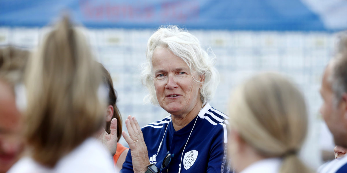 Een goede twee meter verder dan de dug-out van de Oranjemeisjes zit op een blauwe plastic stoel de bondscoach van U18. In de ene hand een groot coachbord, de andere hand rondom haar mond, om extra volume te creëren. ‘Ritme zoeken en houden’, was vooral de boodschap die veelal over het veld gescandeerd werd.
