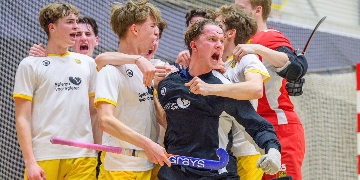 Vreugde bij Klein Zwitserland MO18 na de winst in de halve finales van het NK Zaal op SCHC. Foto: Bart Scheulderman