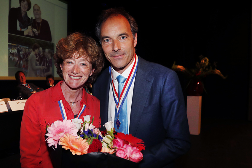 Karin Pannekoek krijgt de speld als erelid van de KNHB opgespeld door bondsvoorzitter Erik Cornelissen. Foto: Willem Vernes