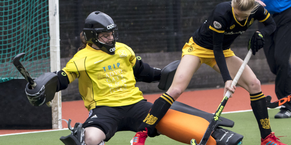 Keepster Jantien Gunter van Groningen stopt de strafcorner van Laren in de Livera Hoofdklasse Dames. Foto: Jacob Gunter