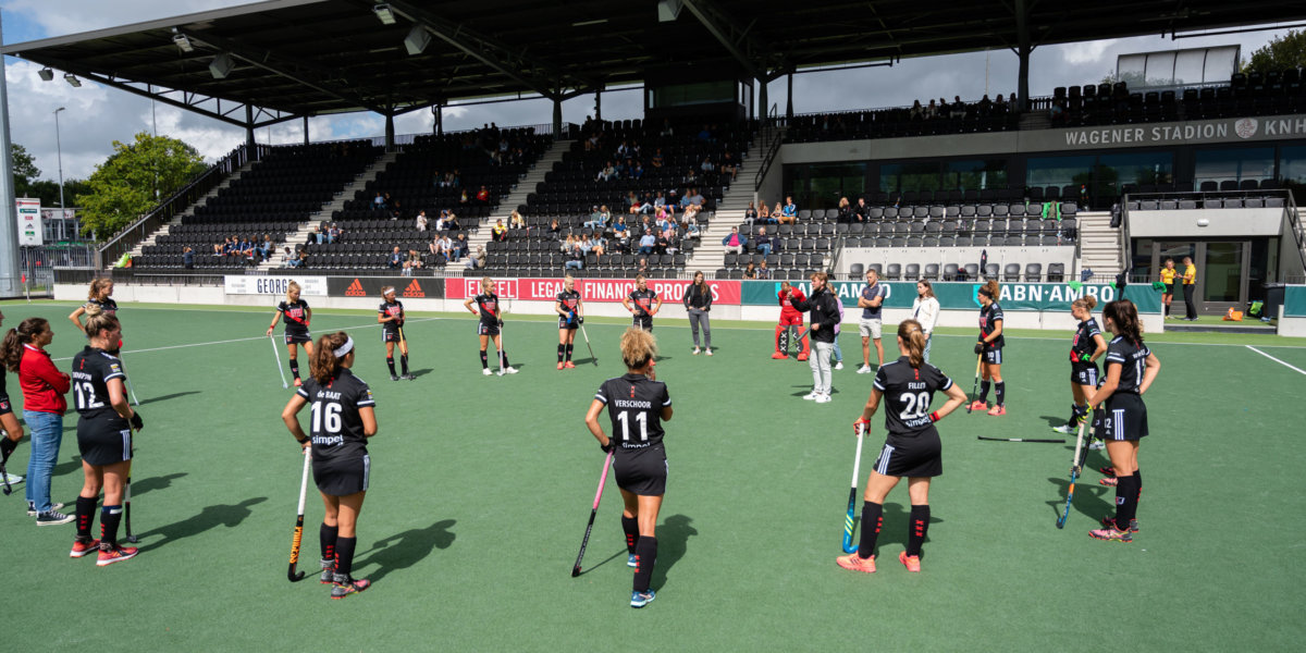 ‘Niemand wil besmet worden. We zijn voorzichtig. Als we in een kring gaan staan, doen we dat op anderhalve meter. Zowel tijdens de wedstrijd als op de training. De rijen boven de dug-out laat ik tijdens de competitie het liefst afzetten, zodat er genoeg ruimte voor ons is. Dat is het voordeel van deze tribune. Hier kan het. Vorige week speelden we bij hdm. Daar was het lastiger. Als begeleiding hebben we toen niet in de dug-out gezeten en sommige wisselspeelsters hingen tegen de boarding aan. Prima. Als we anderhalve meter afstand kunnen houden, doen we dat.’