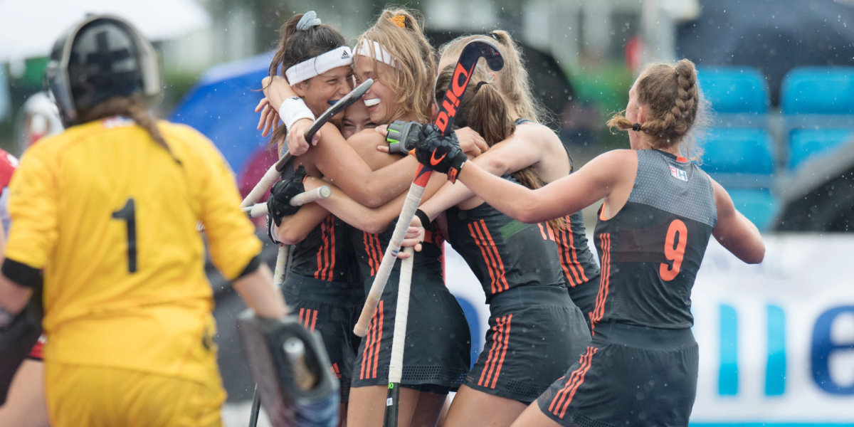 Nederlands Meisjes U18 viert feest na het behalen van de Europese titel in Santander in 2018 na de 5-0 winst in de finale op België. Foto: Worldsportpics/Frank Uijlenbroek