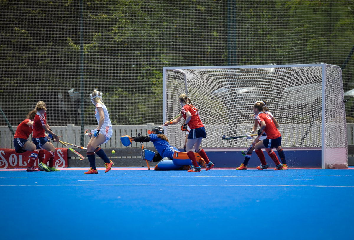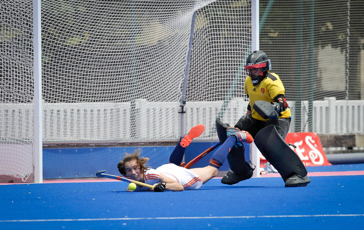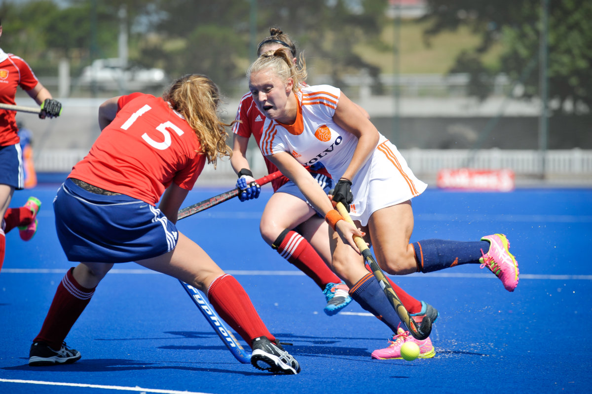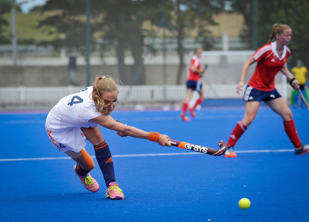 De Oranje-meiden begonnen voortvarend aan de wedstrijd. Na vier minuten lag de bal al in het Engelse doel: Pien Sanders was de doelpuntenmaakster. In het vervolg van de wedstrijd was het de ene na de andere strafcorner die erin vloog. Hester van der Veld, Michelle Fillet (2x)en Minout Mink rondden af. Het resultaat van veel trainen op dit onderdeel. Tot slot zorgde Maud Renders met een velddoelpunt voor de eindstand.
