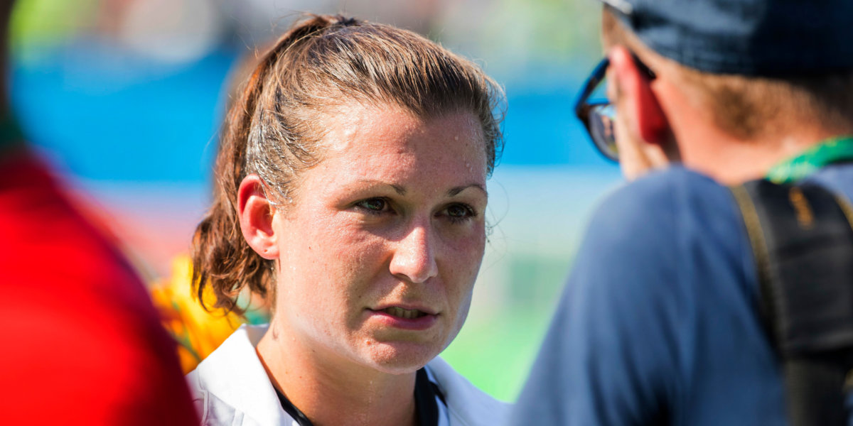Een minuut of 10 na afloop van de kwartfinale van Duitsland tegen de Verenigde Staten (2-1) dropen bij Julia Müller de zweetdruppels nog steeds van haar voorhoofd af. Het was zó warm dat de pauzes tussen de kwarten enkele minuten langer duurden dan normaal.
