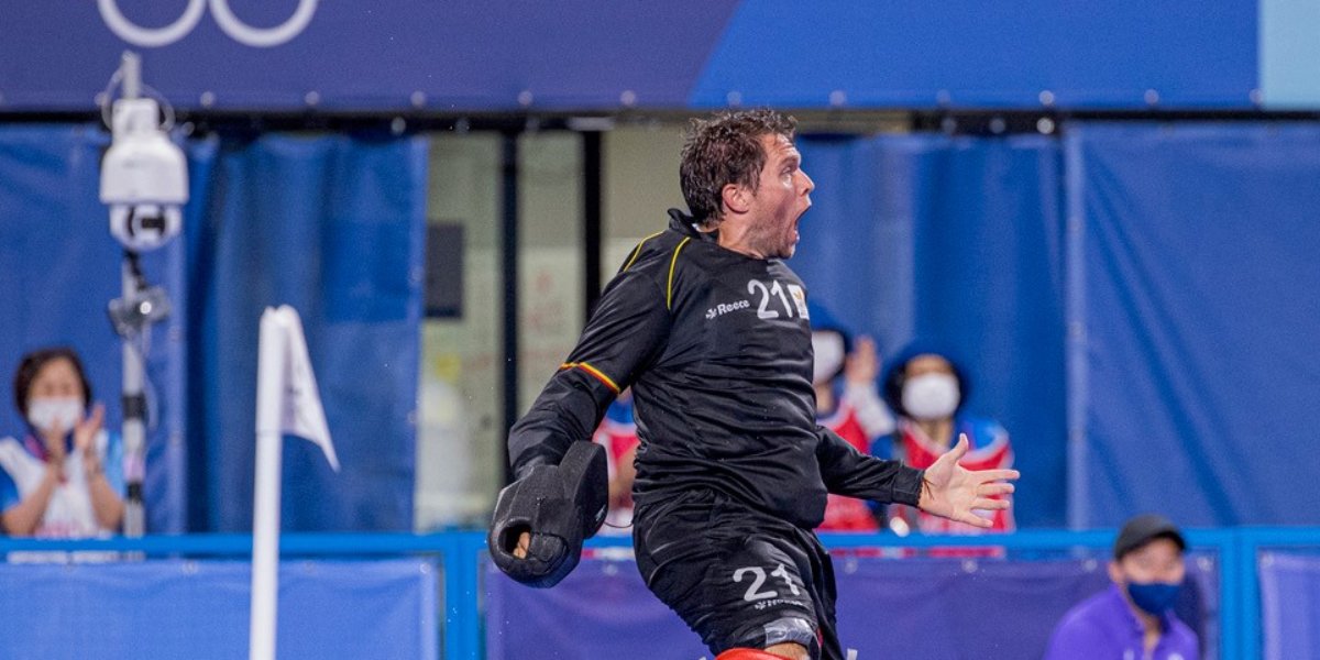 Keeper Vincent Vanasch van België na de gewonnen shoot-outs in de olympische finale tegen Australie.