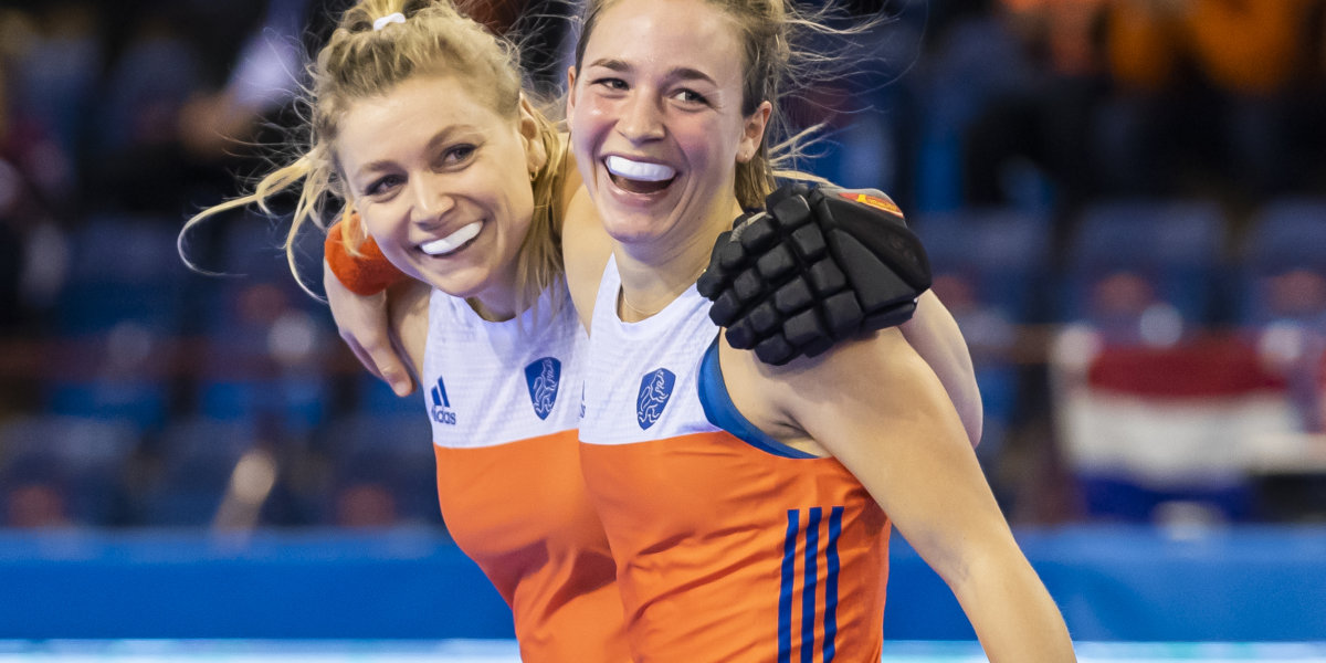 ‘In de halve finale is Tsjechië geen partij voor Oranje (4-1). De blijdschap spat er daarom ook af bij Lisa Post (rechts) en Lisanne de Lange (links) na de eerste goal.’