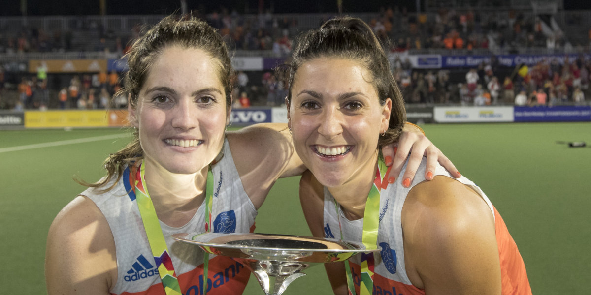 De wisselspeelsters Frédérique Matla, Malou Pheninckx en Josine Koning staan rond het laatste fluitsignaal klaar om het veld in te stormen. Foto: KNHB/Willem Vernes