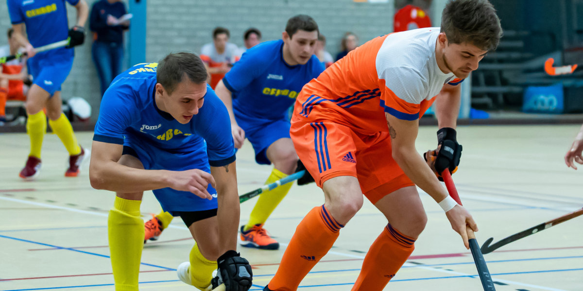 Timo Goor geeft de strafcorner aan in het oefenduel van de Oranje Heren Zaal tegen Oekraïne in voorbereiding op het EK Zaal in Berlijn. Foto: Willem Vernes