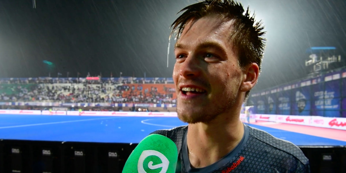 Aanvaller Thierry Brinkman reageert voor de camera van Hockey.nl op de chaotische, maar gewonnen wedstrijd tegen Engeland, om de zevende plaats op de HWL Final in Bhubaneswar.