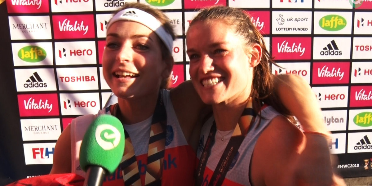 Alyson Annan, Xan de Waard, Lidewij Welten, Eva de Goede, Graham Shaw (Ierland) en Carlien Dirkse van den Heuvel reageren voor onze camera na de 6-0 winst van de Oranje Dames op Ierland en daarmee het veroveren van de wereldtitel.
