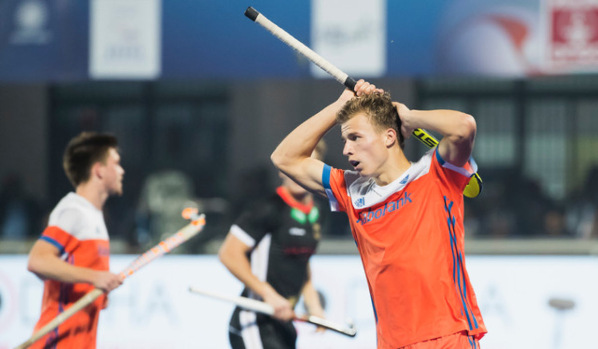 BHUBANESWAR – Bjorn Kellerman (Ned) heeft de stand op 1-2 gebracht tijdens de Hockey World League Finals , de kwartfinale wedstrijd Duitsland-Nederland. Foto: Koen Suyk