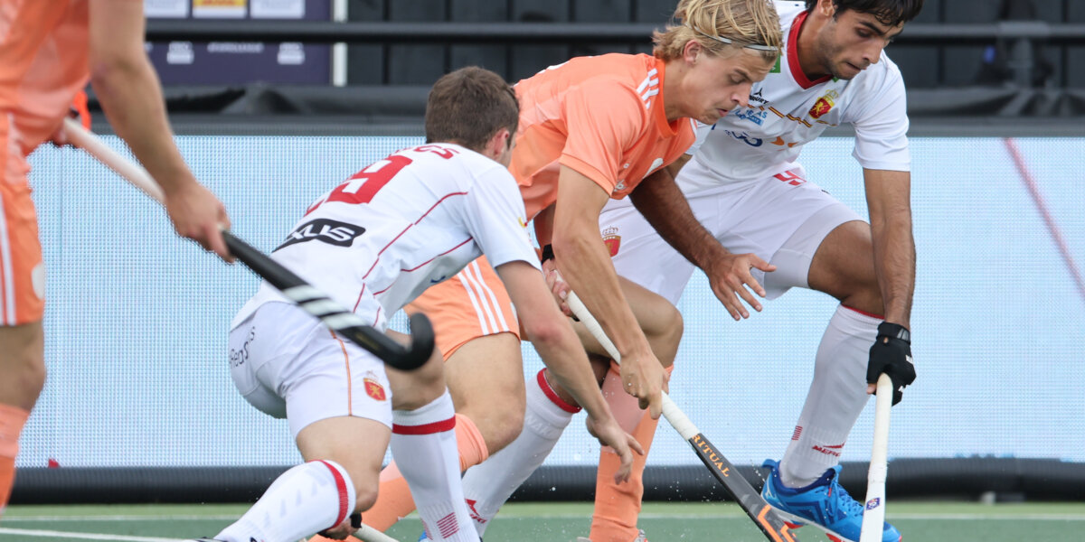 Justen Blok in actie voor de Oranje Heren tijdens de Pro League-wedstrijd tegen Spanje in Den Bosch. Foto: Willem Vernes