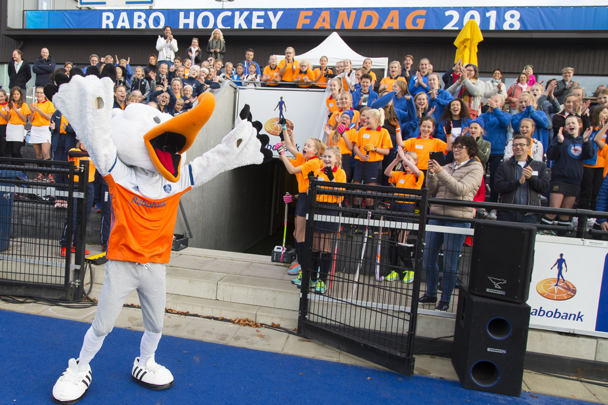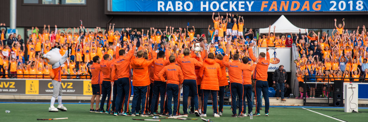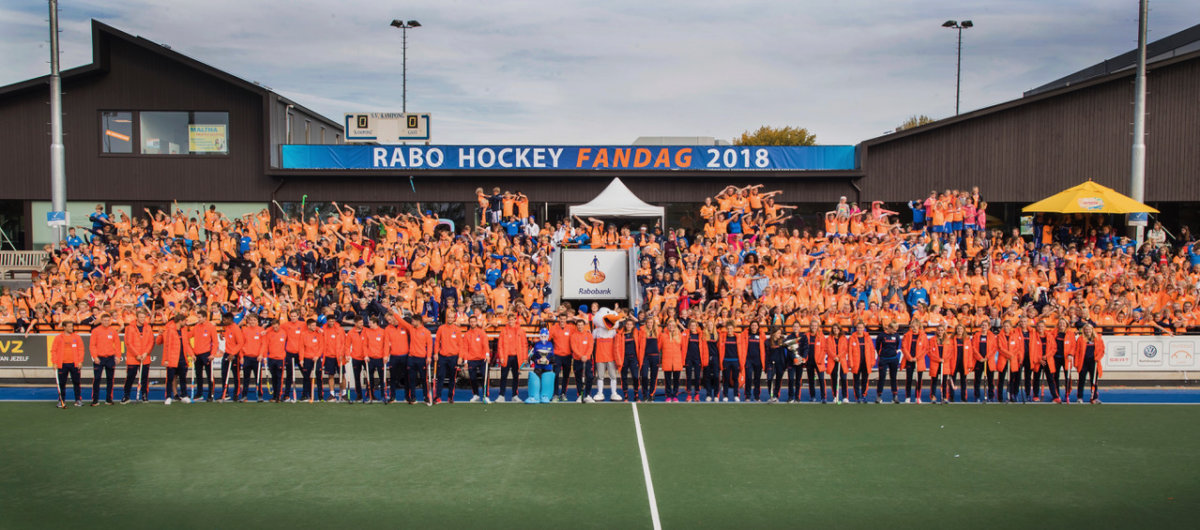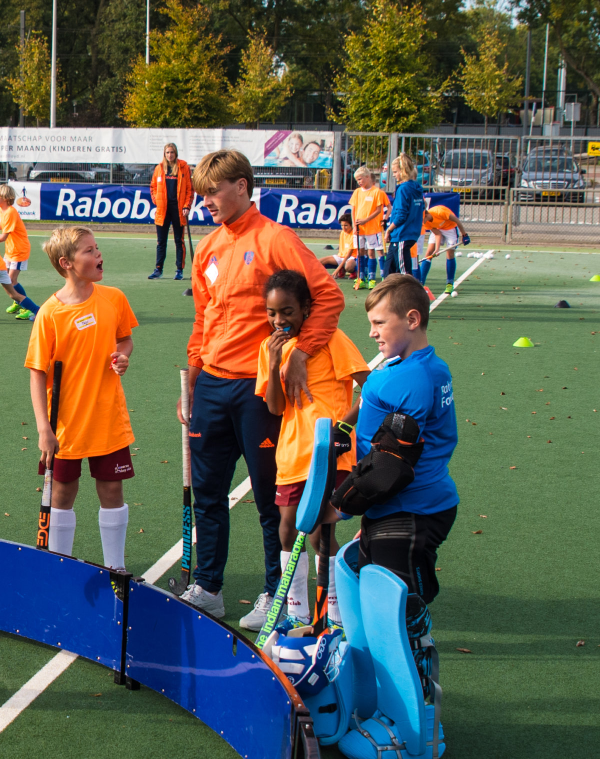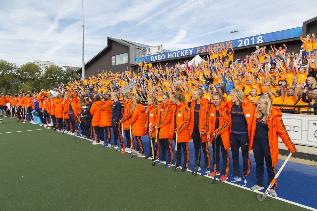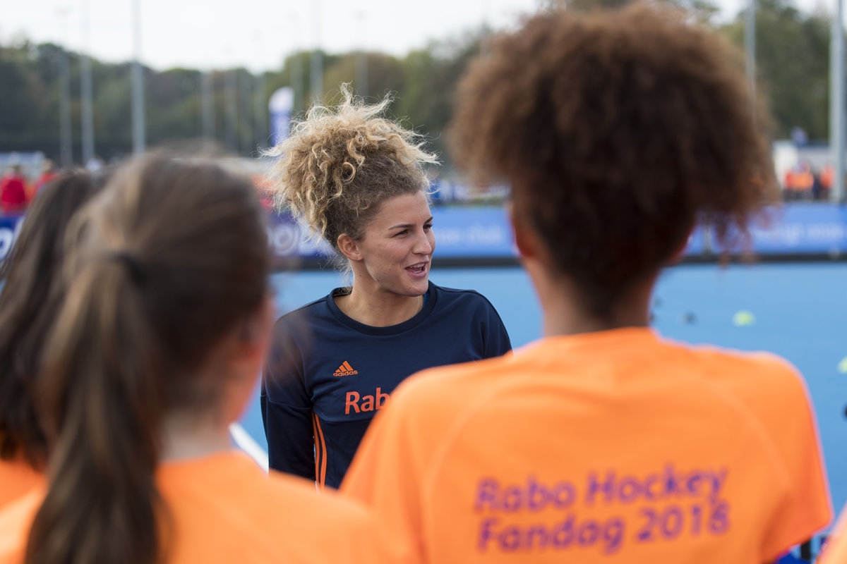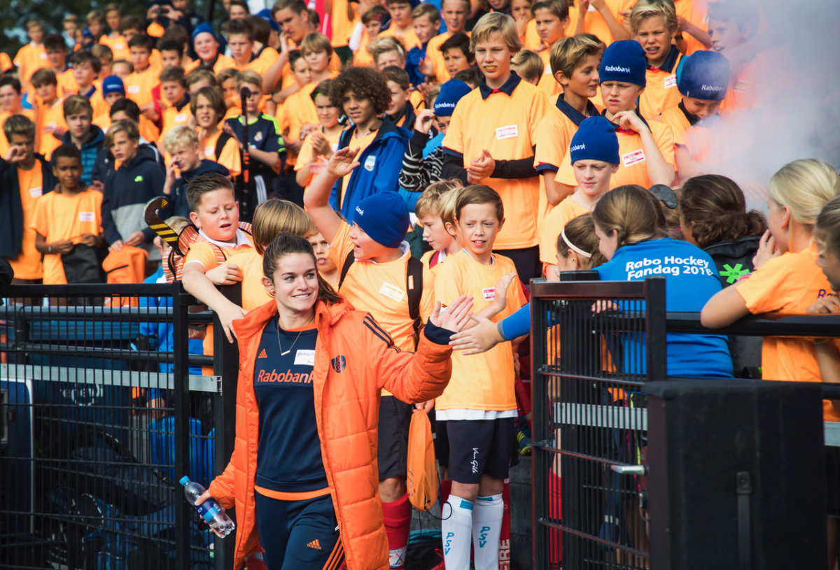 Stralende internationals én nog meer stralende kinderen op de Rabo Fandag 2018 zaterdag op het complex van Kampong in Utrecht. De honderden uitverkoren kinderen konden pielen met Jorrit Croon, de sleeppush leren van Caia van Maasakker of Seve van Ass en de backhand slaan met Derck de Vilder. Er was een gezamenlijke lunch op het veld en natuurlijk werden de Oranje-helden uitgebreid gehuldigd.