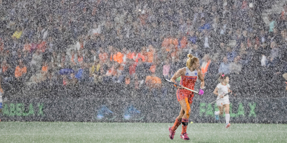 Suyk: ‘De enorme hoosbui op vrijdagavond tijdens de openingswedstrijd van het EK. Dat deed me denken aan het EK in Mönchengladbach ,waar ik een van mijn mooiste hockeyfoto’s maakte. Een foto met Kim Lammers die na het behalen van de titel over het veld glijdt.’