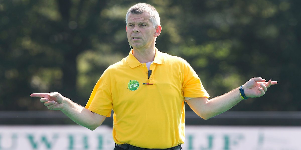 Scheidsrechter Juus de Kempenaer heeft een lichte herschudding overgehouden aan de botsing met Zwolle-coach Bert Bunnik zaterdag tijdens het playoutduel van Zwolle tegen Myra.