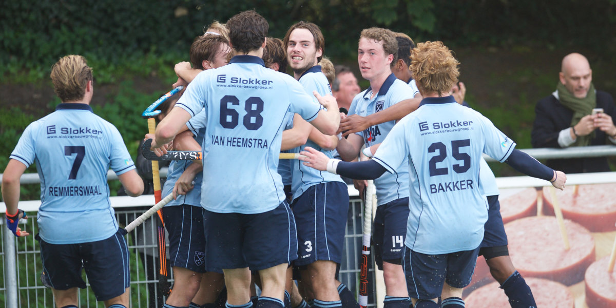 Klein Zwitserland-aanvoerder Wouter Rens omringd door dolblije spelers van Laren. Foto: Orange Pictures/Willem-Jan Dijkdrent