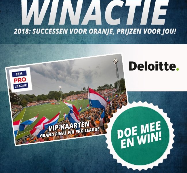 Deloitte verloot het geweldige VIP pakket gewoon nog een keer. Vanaf vrijdag 28 december om 12.00 uur kan jij kaartjes winnen voor de finale van de FIH Pro League. Je mag de wedstrijd bekijken vanaf de VIP hoofdtribune en je krijgt toegang tot de Deloitte lounge. Kijk op het Facebook.com/hockey.nl en Instagram.com/hockeynl wat je moet om het pakket te kunnen winnen.
