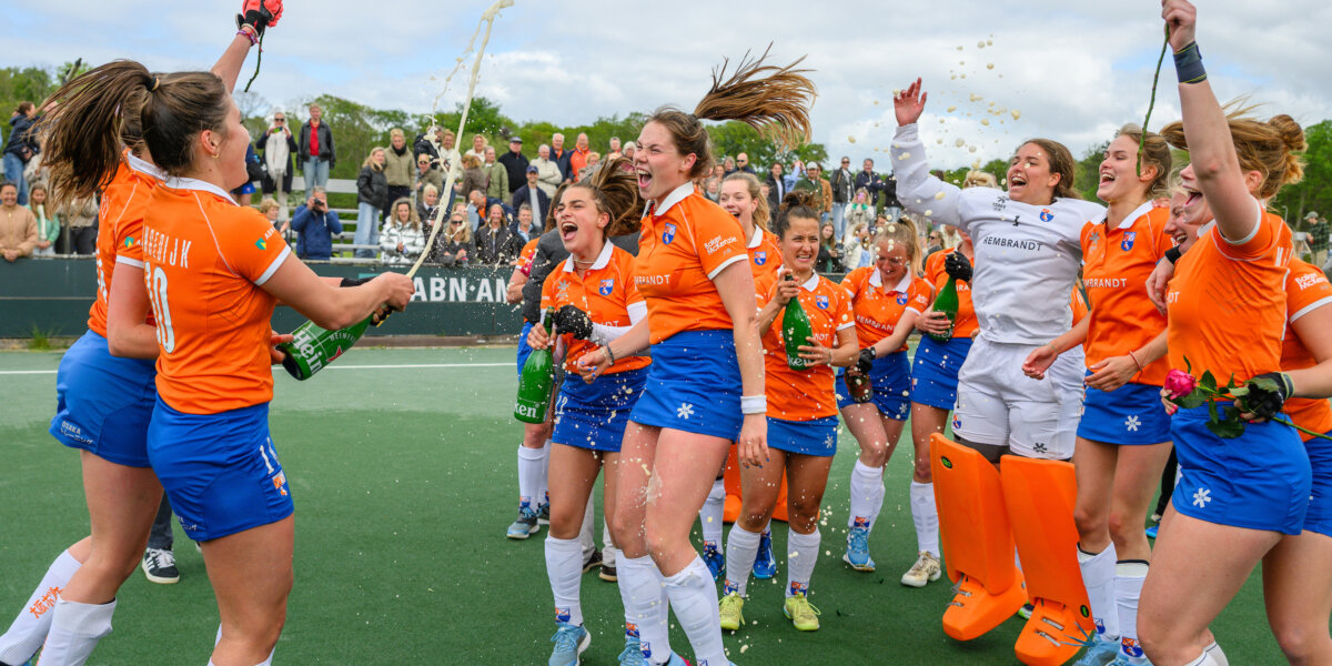 De dames van Bloemendaal spelen volgend seizoen weer op het hoogste niveau. De champagne vloeide na afloop op ’t Kopje na de 3-1 zege op Were Di. Omdat concurrent Nijmegen punten liet liggen tegen Leiden, is Bloemendaal niet alleen verzekerd van promotie maar ook van de titel in de Promotieklasse. Tranen waren er in Vught bij MOP dat door de 1-3 nederlaag tegen Schaerweijde volgend seizoen in de Overgangsklasse speelt.