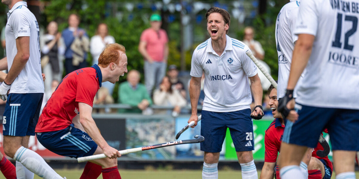 Zelfs na de 3-3 tegen Tilburg staat het Laren van coach Allard van Heemstra nog altijd op polepostion, zien ook Pelle Vos en Joppe Boerstra. Foto: Rogier Balk