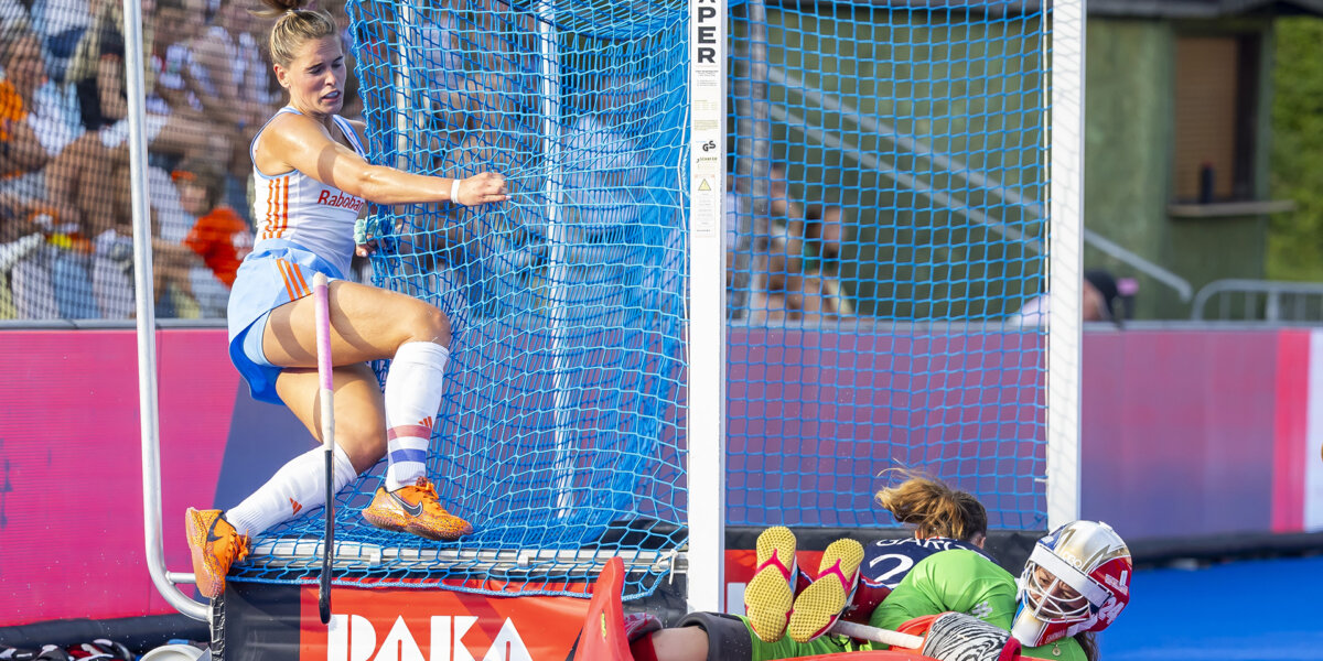 4. Pien Sanders, inspirator en vechtjas die altijd vooropgaat in de strijd, vliegt uit de bocht en kan nog net het doelnet vastpakken om haar val te breken.