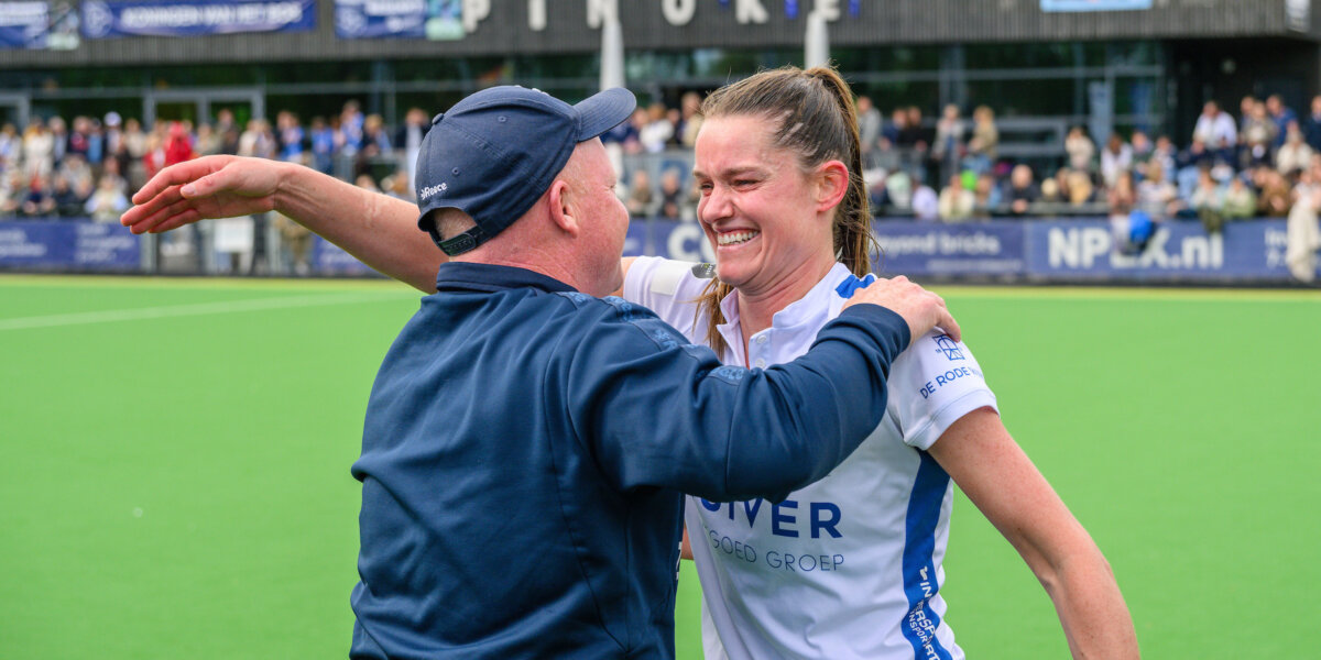 ‘Het voelt fantastisch’, zegt Lidewij Welten op het veld van Pinoké, terwijl de rest van haar team nog feestviert. Ze geniet als ze om zich heen kijkt. ‘Ik ben zo trots op de meiden. Wat een heerlijke ontlading. We hebben het zo goed gedaan’, vertelt ze trots. Welten kwam in de zomer van 2022 naar Kampong en maakte het roerige vorige seizoen, waarin Van de Kieft werd ontslagen van dichtbij mee. ‘Het is niet normaal wat er in een jaar tijd gebeurd is. De staf weet precies de juiste snaar te raken.’