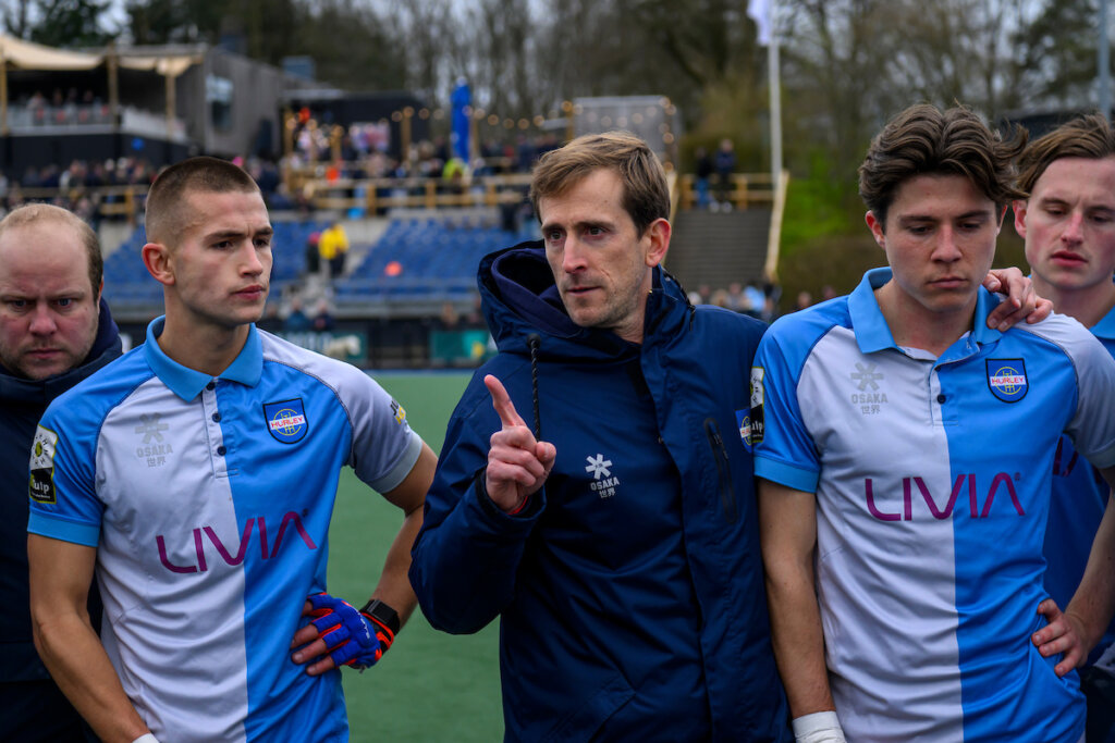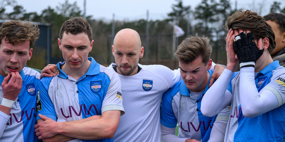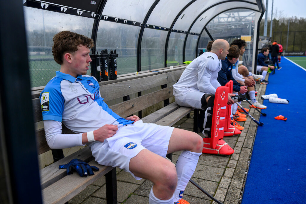 De wedstrijd was al zo’n twintig minuten afgelopen, toen Romijn nog in de dug-out zat. Op het houten bankje staarde hij somber voor zich uit naar het lege veld. Soms keek hij even naar links, waar zijn teamgenoten Laurens Nievelstein, Noam Sheridan en Nikas Berendts precies op dezelfde manier zaten. Bedrukt en verslagen. Rechts van ‘m was Benjamin Walker nog aan het treuren. De vleugelspeler viel in het laatste kwart uit met kramp.