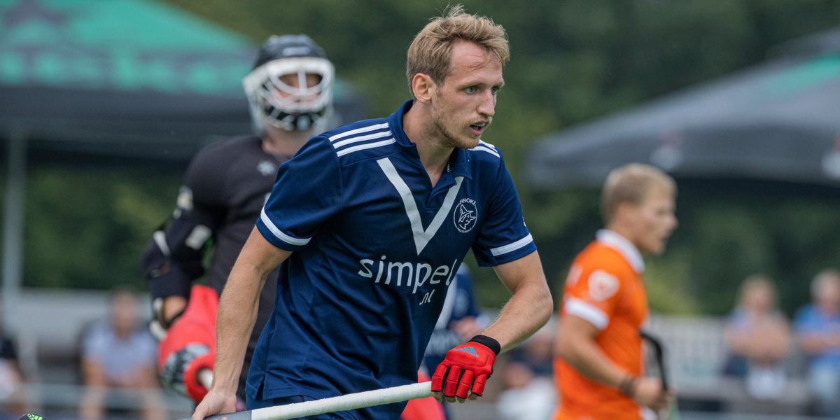 Niklas Wellen aan de bal voor Pinoké op de huid gezeten door Bloemendaal-speler Daan Dullemeijer. Foto: Koen Suyk