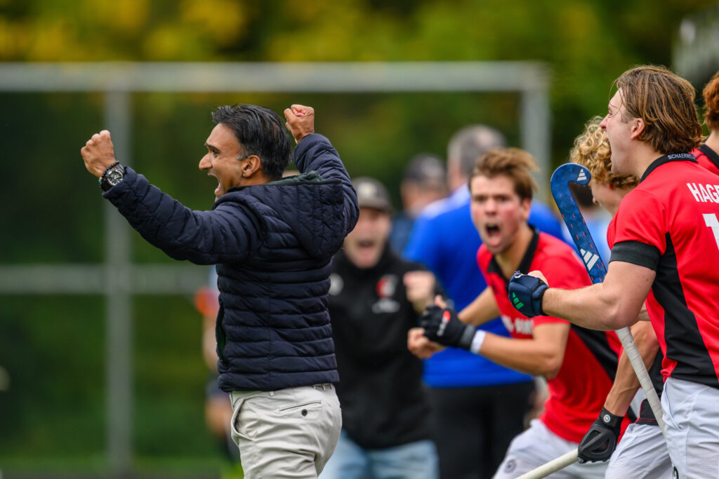Coach Razwan Ahmed juicht na de zege van Schaerweijde op Hurley. Foto: Bart Scheulderman