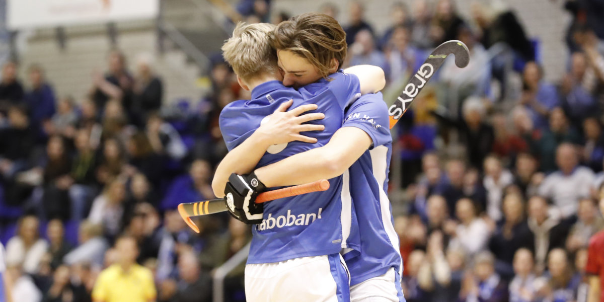 Mink van Dartel (r) scoort een van zijn vijf doelpunten voor Kampong JB1 in de NK-finale tegen Nijmegen. Foto: Koen Suyk