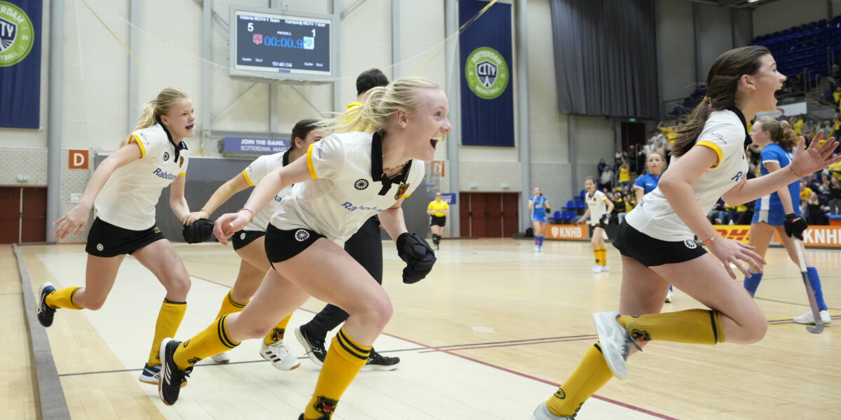 De bomvolle zaalhockeydag zit erop in het Topsportcentrum in Rotterdam. Inmiddels zijn de zes NK-titels verdeeld. Victoria MO14-1, Bloemendaal JO14-1, KZ MO16-1, Pinoké JO16-1, Kampong MO18-1 en Den Bosch JO18-1 mogen zich een jaar lang de beste zaalhockeyers van het land noemen.