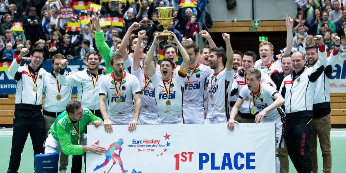 Voor de zestiende maal in de historie hebben de Duitse heren de Europese titel in de zaal gewonnen. In de finale in het Horst Korbert Sportzentrum in Berlijn werd titelverdeiger en wereldkampioen Oostenrijk met 6-3 verslagen. Nederland pakte het brons door Rusland met 11-3 te verslaan. In de degradatiepoule speelden België en Tsjechië zichzelf veilig ten koste van Polen en Oekraïne.