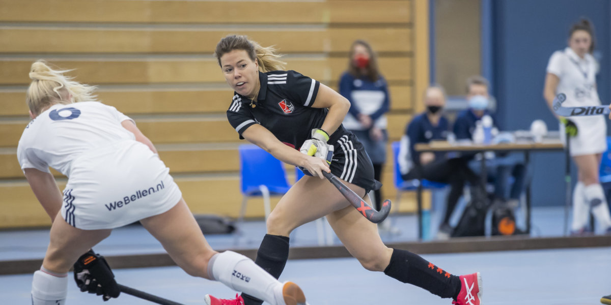 Maar hoe belandde Jaspers dan toch weer in de Hoofdklasse – in de zaal welteverstaan? ‘Dames 1 en Dames 2 trainen samen in de zaal, zodat we partijen kunnen doen. De coach van dames 1, Robert Tigges, kende ik al uit het hockeywereldje. Toen de eerste speelronde eraan kwam, vroeg hij of ik mee wilde doen. Dat leek mij wel wat. En toen ik met mijn eigen team vervolgens geen wedstrijden meer mocht spelen, bood ik aan vaker in te vallen. Het was wel even schakelen. Niet alleen aan de speelsters, die ik vooral ken als tegenstanders, maar ook omdat ik nu weer in systemen moet spelen. Bij Dames 2 maakt het niet uit waar ik sta. Alles is heel vrij.’