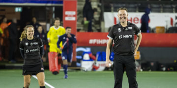 Scheidsrechter Laurine Delforge staat haar mannetje tussen de Oranje Heren